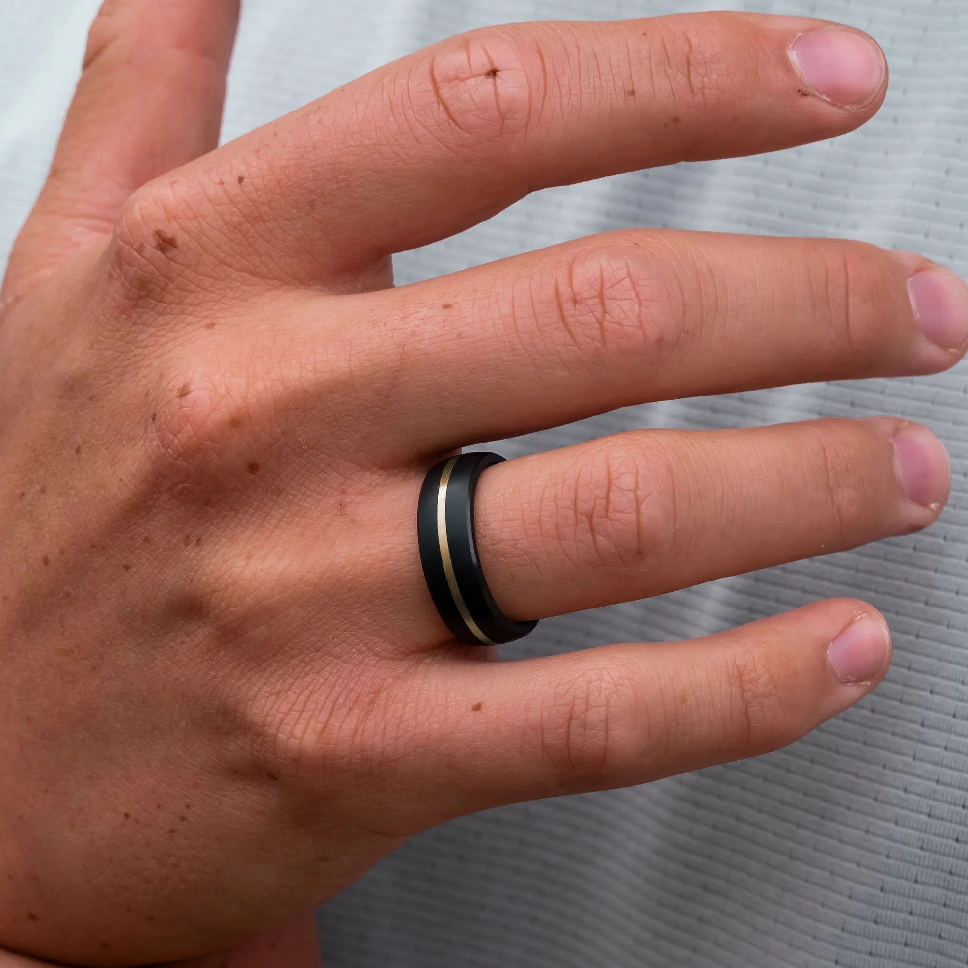 Elysium Nyx - Solid Black Diamond ring featuring a 24k Yellow Gold inlay. Each of our rings is made of millions of pressed diamond crystals formed into a solid diamond band that becomes black due to the enormous pressure & heat. Elysium Black Diamond is rated a 10 on the Mohs scale, making it the hardest and most-scratch resistant material on earth, the perfect symbol of your commitment.